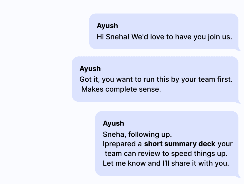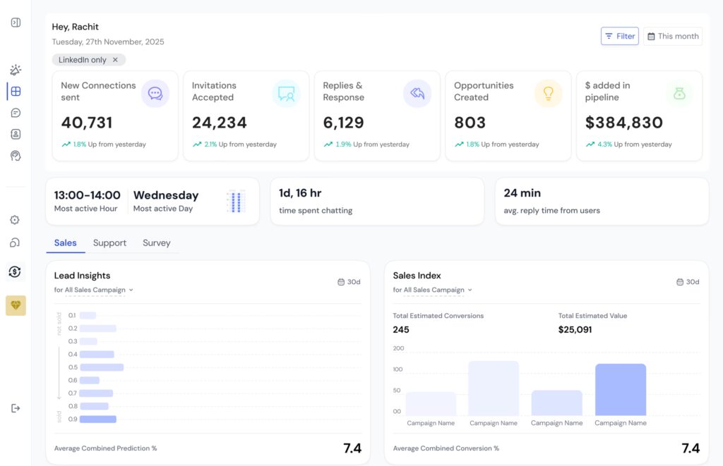 Think of it as your top 1% sales rep, building connections, having personalized conversations and driving up to 5x higher conversions on LinkedIn & WhatsApp chats, all on autopilot at a fraction of the cost.”