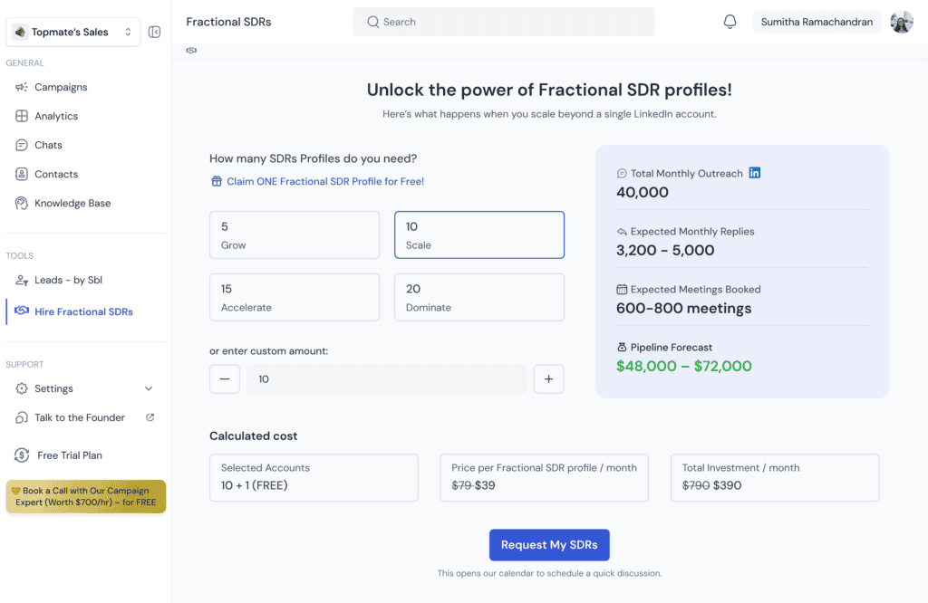 Here’s where it gets interesting. We’ve built an entire network of verified SDRs who are ready to work with you with their LinkedIn presence for your campaigns. When you request fractional SDR profiles through SBL, we can get them connected to your workspace in under 48 hours.