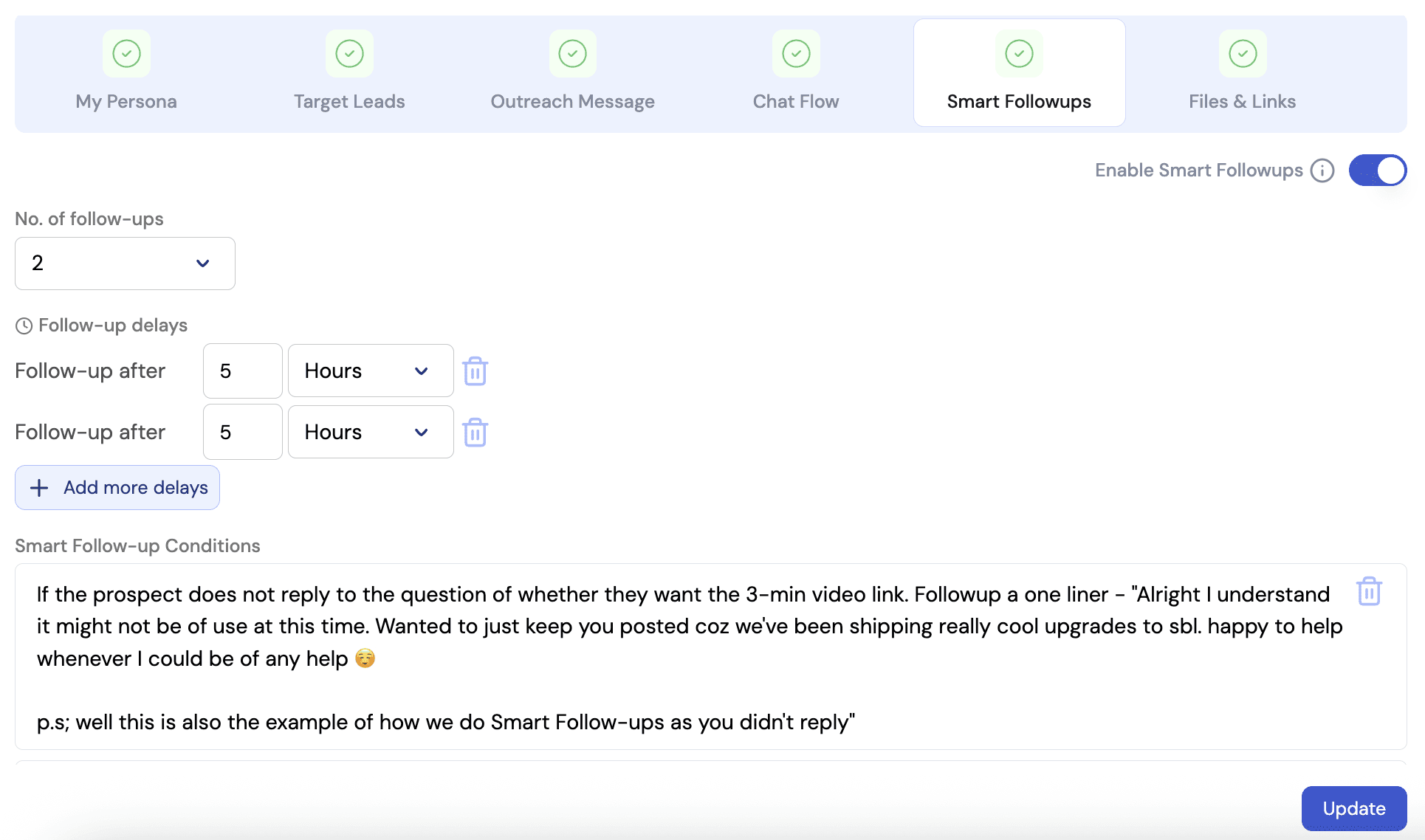 Set how many follow-ups you want along with the delay timings (e.g., first followup after 6 hours of inactivity, second followup after 2 days).